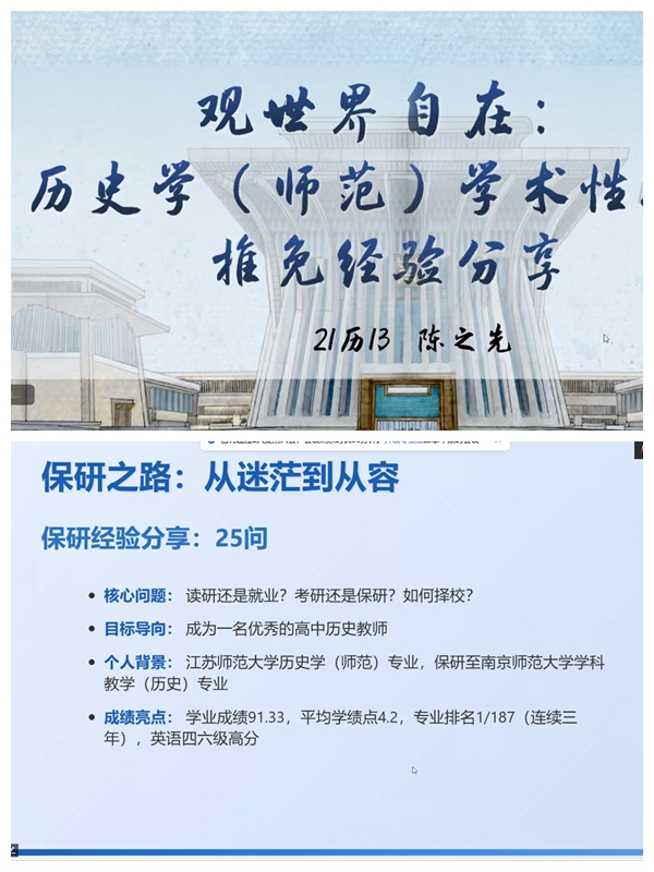 推免至中国社会科学院历史理论研究所的陈之先结合自身的推免经历,从资格的获取以及推免的过程等角度对学硕类型的推免进行了细致地讲解,介绍了夏令营、预推免等推免流程,以及部分院校的推免要求。随后,推免至南京师范大学的卢冠宇从学科教学(历史)的角度进行分享,结合25个推免的核心问题以及个人经历讲解了自己的保研之路,并且希望同学们能保持自信、专注自我。