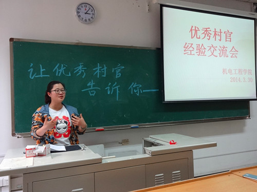 为了更好的动员、宣传我院的大学生村官报名工作,3月30日下午,机电工程学院特邀徐州市泉山区金山街道屯里社区大学生村官史雪露、泉山区滨湖街道办事处大学生村官惠子在12号楼102C举办了一场“让优秀大学生村官告诉你—机电学院学子与大学生村官面对面”的经验交流会。出席本次交流会的有我院就业辅导员朱悦老师以及大二至大四将来有意愿报考大学生村官的部分同学。
