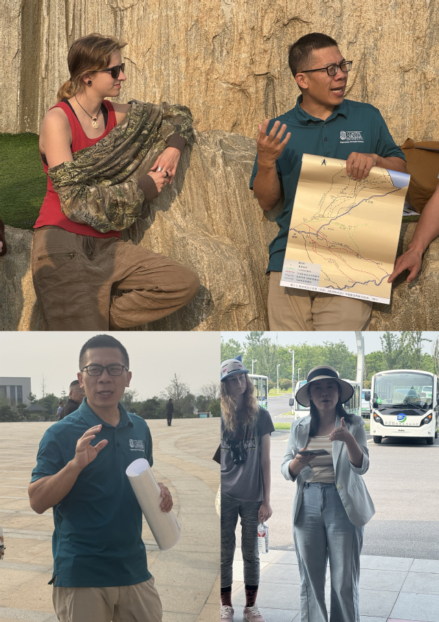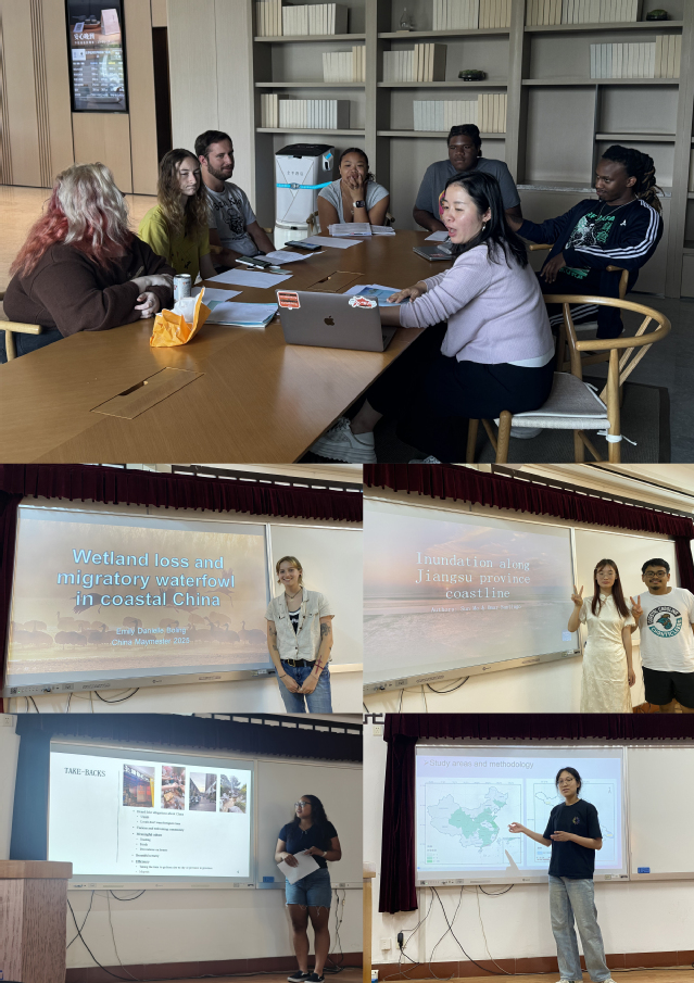 本次暑期学校的野外考察由地理测绘与城乡规划学院设计实施。5月21日至29日期间,师生团队先后赴江苏、山东两省的7个区域开展实地调研,考察范围涵盖微山湖湿地、京杭大运河沿岸典型城市段、海岸带滩涂生态系统、盐城湿地保护区以及长江入海口等兼具生态价值与人文特色的重点区域。考察期间,中美学生混编成研究小组,运用实地勘测、问卷调查和文化观察等方法,系统分析了典型生态系统的演化规律、滨水城市空间结构变迁特征以及沿岸居民生活方式演变趋势。通过对比中美海岸带治理模式与社区适应策略的异同,学生们从跨文化视角深化了对生态适应机制的理解。在全程参与指导的中美教师团队带领下,学生们基于实地考察形成了多项阶段性研究成果,主要包括:中国海岸带湿地演变与水鸟迁徙规律研究、人类活动对长江鱼类繁殖的影响评估、沿海平原生态价值分析、公众气候认知以及气候变化对熊猫影响的初步研究等。此外,双方师生还通过美食文化体验、民俗交流等活动,进一步促进了跨文化理解。美方师生对考察活动的专业性和组织水平给予了高度赞赏。