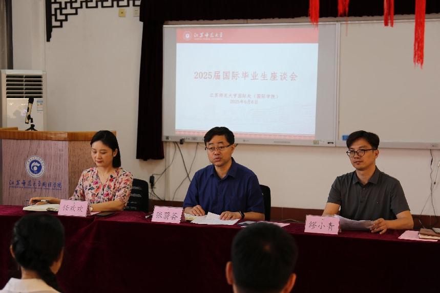 6月6日,国际学院举行2025届国际学生毕业生座谈会。国际处(国际学院)直属党支部书记张蓊荟、副书记任欢欢、副院长缪小青与来自各学院的12名国际学生毕业生代表座谈交流,共同回顾成长历程、畅谈未来愿景、送上毕业祝福。副院长缪小青主持座谈会。