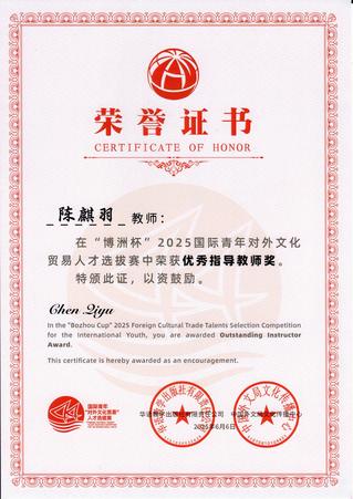 6月6日,由中国外文局文化传播中心与华语教学出版社联合主办的“博洲杯”2025国际青年对外文化贸易人才选拔赛颁奖典礼在浙江工业大学(杭州)隆重举行。我校美国籍学生TRABUCCO BRYCE(陶海晨)的视频作品《 我的师大追梦之旅》荣获文化互鉴友好奖,越南籍学生NGUYEN VAN BINH(阮文平)与马来西亚籍学生LEW NING XIN(廖宁欣)的视频作品《茉莉花(徐州版)》荣获文化传播活力奖,陈麒羽老师获得优秀指导教师奖,江苏师范大学荣获院校优秀组织奖。