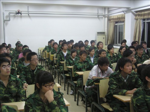 为对新入校的大学生进行军事训练,增强大学生的国防意识,为国防建设培养高素质后备人才,10月12日晚6点,机电工程学院在田家炳工学院604C隆重举行2009级新生军训动员大会,院党委于如信副书记、团委彭晨老师出席动员大会。