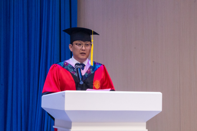 典礼在庄严的国歌声中拉开序幕。外国语学院院长于涛教授致辞,向2025届毕业生顺利完成学业表示祝贺,并向悉心指导他们的老师、辛勤养育他们的父母致以感谢。于院长饱含深情地回顾了毕业生在校期间的点滴成长,充分肯定了全体毕业生在专业学习、社会实践、志愿服务等方面取得的优异成绩,勉励毕业生们牢记“崇德厚学,励志敏行”的校训和“明德博学,融通中外”的院训,勇于担当,追求卓越,为讲好中国故事、促进中外文化交流贡献力量。祝愿毕业生们乘风破浪,一往无前,施展才华,闪耀光芒,收获幸福,成就梦想!