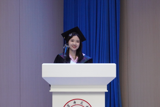 2025届英语师范专业本科毕业生夏唐文轩同学作为毕业生代表发言。她回顾四年所得,深切表达对母校、老师的感激之情和对同窗的不舍之情,以及即将走向深造之路的坚定信心。