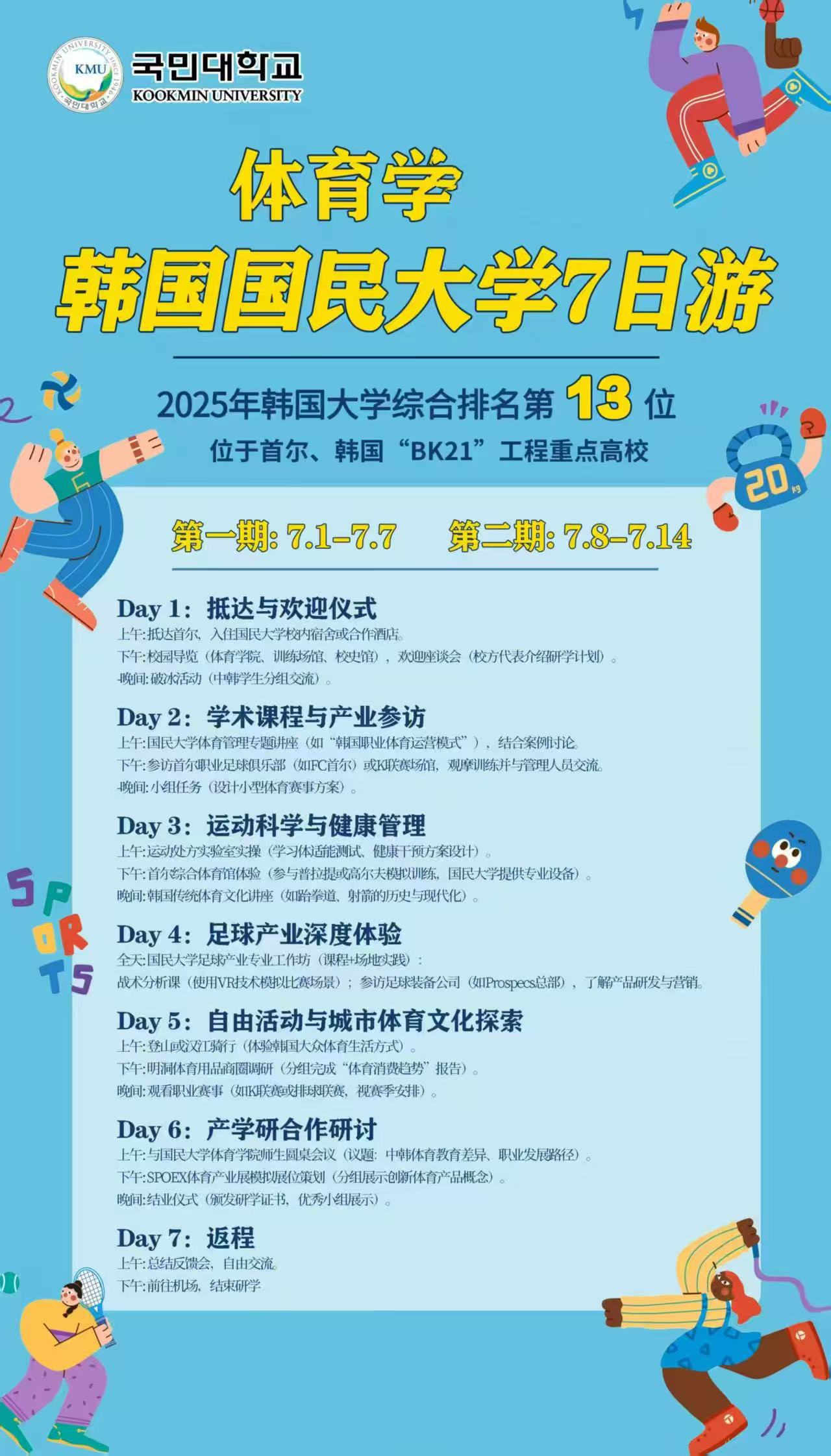 为开拓学生国际化视野,提升人才培养质量,2025年暑期组织体育学院学生赴韩国国民大学开展海外文化交流活动。现将有关事项通知如下。