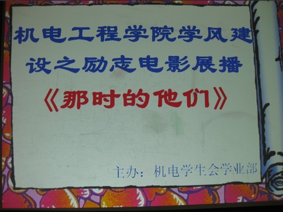 为深入搞好学风建设,增进大一新生对大学生活的正确认识,合理规划自己的大学生活,1114日晚,机电工程学院在12#楼603C、604C播放励志电影《那时的他们》