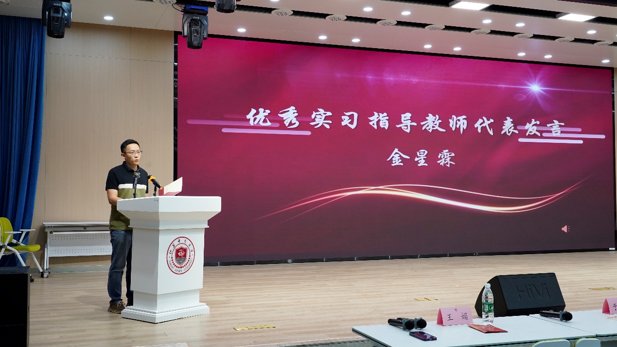 优秀实习指导教师代表金星霖讲述了见证实习生成长的过程,强调教师责任感与严谨态度的重要性,呼吁教育工作者坚守初心,实现教学相长。