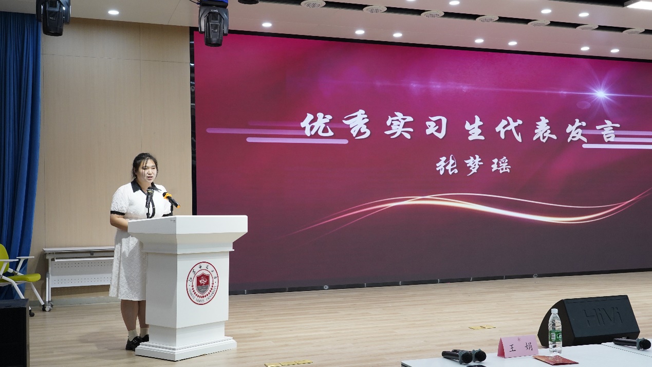 优秀实习生代表张梦瑶分享了从理论走向实践的成长历程,坚定了以 “四有好老师” 为榜样,投身教育事业的决心。