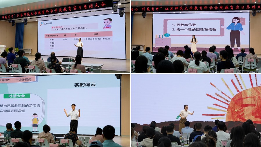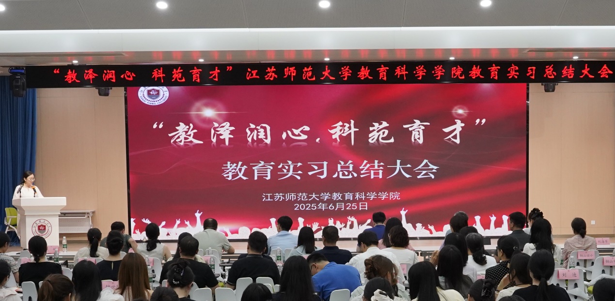 6月25日14:30,教育科学学院(教师教育学院)2025年度教育实习总结大会在路演大厅隆重举行。本次会议由学院副院长王娟教授与2022级小学教育本科生李诗奕共同主持。徐州市教育局基础教育处副处长陈小祥、江苏师范大学研究生院院长刘伟、教务处副处长满在江、教育科学学院党委书记张欣、副书记陈遥、挂职副院长刘海军、院长助理于战宇等领导嘉宾,以及青年路小学、民主路小学、大马路小学、徐州市第二实验幼儿园等22个实习学校负责人、15名学院指导教师代表和全体实习生近300人,齐聚一堂,共同检阅实习成果。