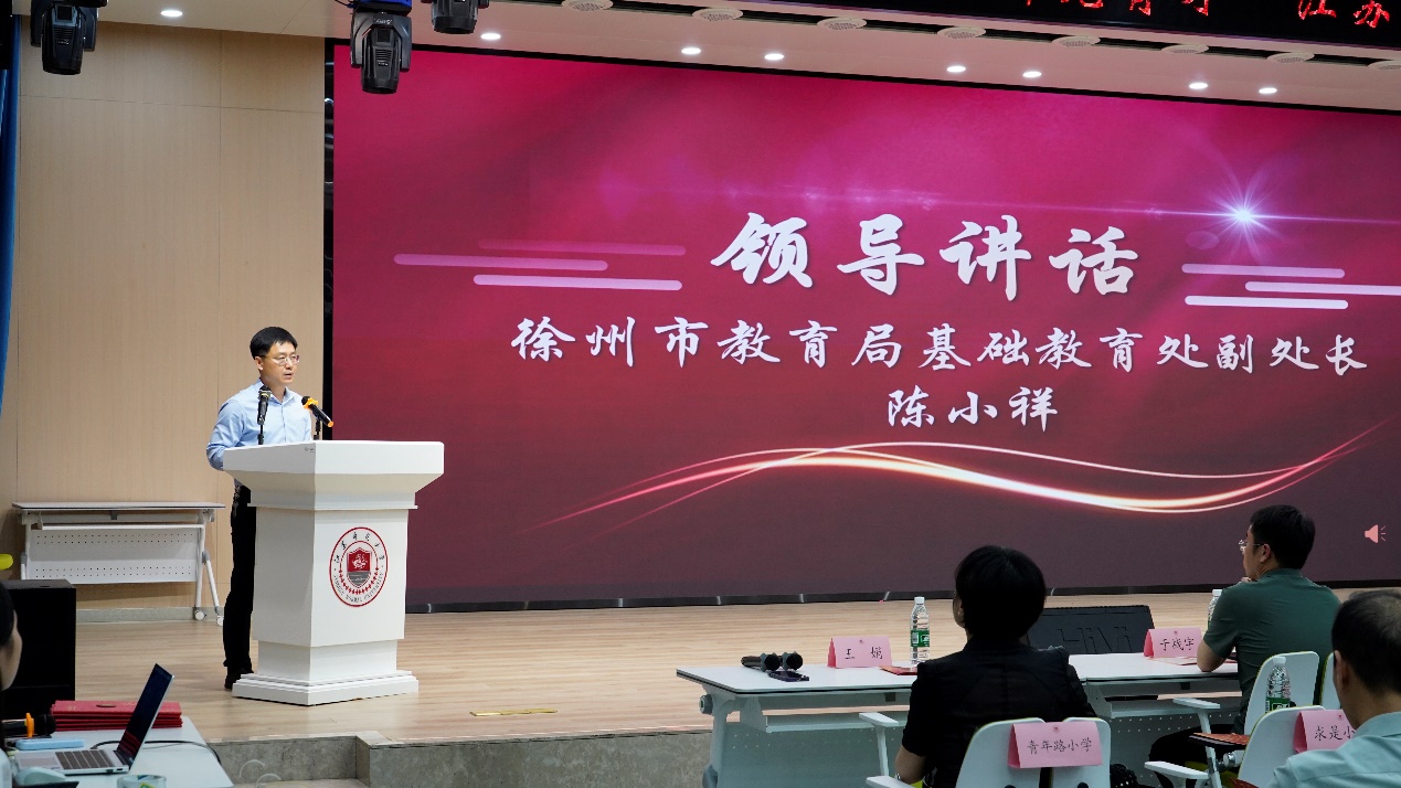 随后,陈小祥副处长全面介绍了徐州市教育情况,包括教育基础概况、政策导向等。他强调,徐州市基础教育以提升教育质量、扩大优质资源为核心,重视教师队伍建设,致力于构建完善的教师培养体系。同时,当下基础教育要注重课程设计与开发的科学性、创新性,以及数字化资源建设,为学生未来发展筑牢根基。陈小祥副处长引用习近平总书记关于教育的重要讲话精神,激励广大青年投身教育事业,为推动徐州市基础教育迈向更高水平、实现教育高质量发展而共同努力,在新时代的教育征程中书写辉煌篇章。