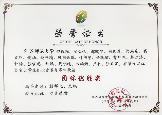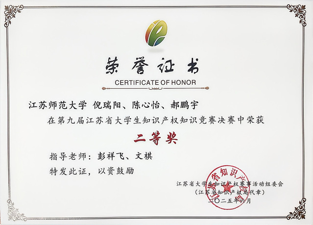 近日,第九届江苏省大学生知识产权知识竞赛决赛圆满落幕。江苏师范大学法学院代表队凭借扎实的专业素养和出色的临场发挥,在全省众多高校中脱颖而出,斩获决赛团体二等奖(全省第五名),同时摘得复赛“团体优胜奖”,彭祥飞、文棋两位老师荣获“最佳指导老师奖”,江苏师范大学获评“最佳院校组织奖”。