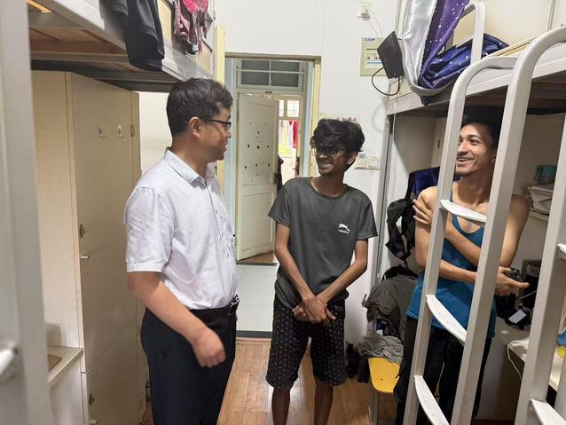 7月5日,国际处(国际学院)直属党支部书记张蓊荟、副书记任欢欢带领班主任深入国际学生宿舍开展安全检查。检查小组重点排查了用电安全、消防设施配备及卫生环境状况,对发现的插线板乱接、杂物堆积等安全隐患现场提出整改要求。检查过程中,张书记详细询问了国际学生的暑期安排,重点强调暑期安全的重要性,叮嘱学生外出时遵守中国法律法规,做好安全防护。同时,他鼓励学生利用假期提升专业素养,深入了解中国文化,当好中外文化交流的使者。