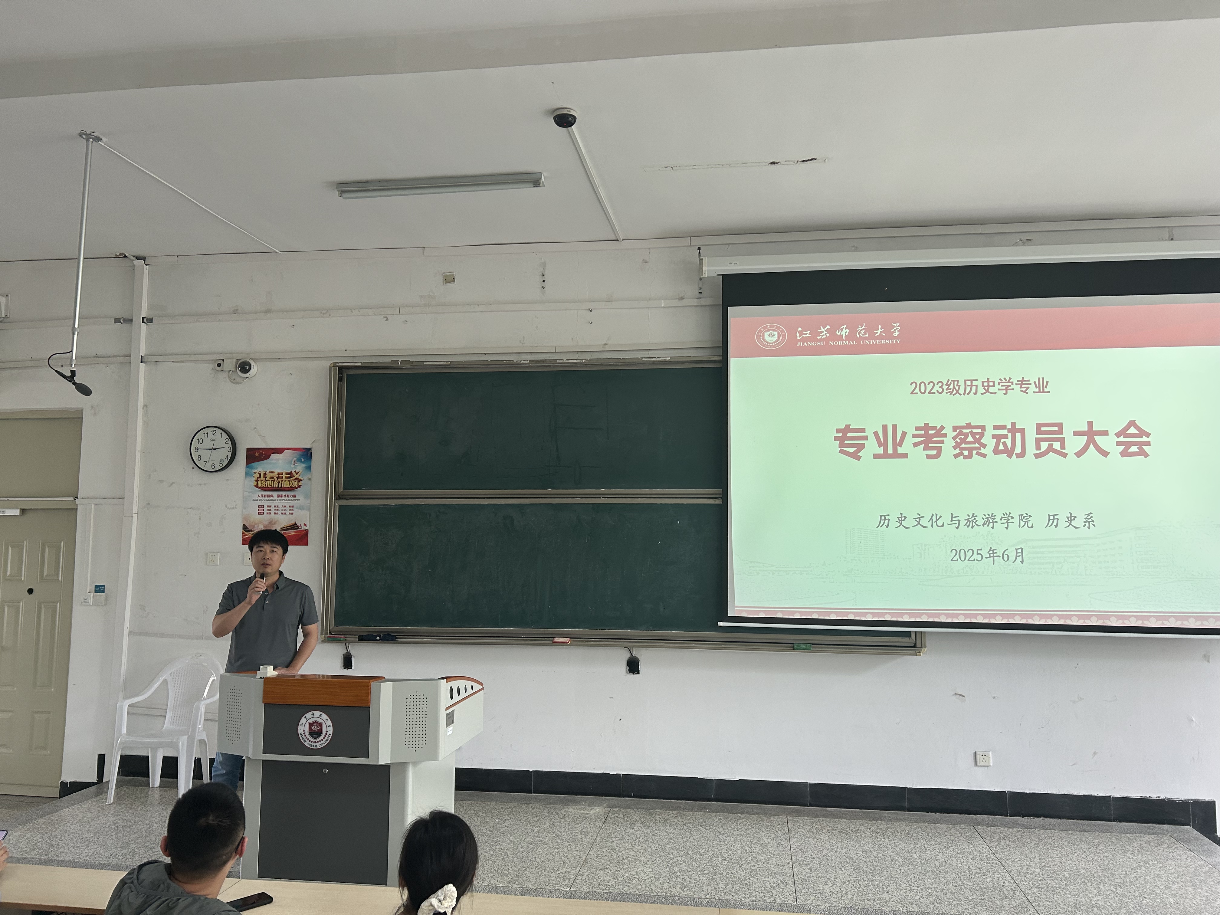 为提升历史学师范生学科专业能力和核心素养,江苏师范大学历史文化与旅游学院开展了2025年专业考察实习活动,2023级历史学(师范)专业共有152名学生参加本次活动。为保障本次专业考察实习有序推进,6月20日学院召开了考察动员大会。大会由郝天豪老师主持,杜登副书记、张红霞副院长分别发表讲话。本次动员大会明确了此次历史考察实习的目标意义、行程安排和有关纪律要求。