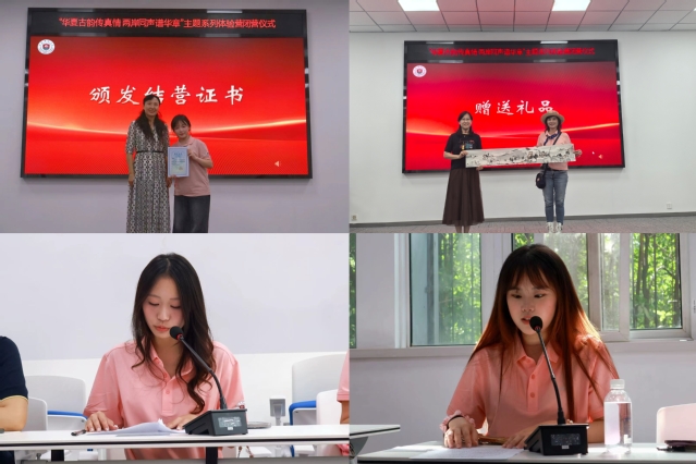 7月9日闭营仪式上,视频回顾令师生动容,体育学院党委书记徐二荣表示“相聚虽短,但两岸青年结下的友谊绵长,期待这份因文化而生的缘分,成为连接海峡两岸的新纽带”,台湾学生感悟“不仅增进了我对中华文化的认识,更让我感受到两岸青年在文化交流中的共鸣与连结”。体育学院院长房冬梅为台湾学生代表颁发了结营证书,这份证书不仅是对本次体验的认可,更是两岸情谊的珍贵凭证;港澳台办公室副主任李丹为陳彩雲老师赠送了书画作品,以独特的文化载体传递敬意与感谢。闭营表演中,台湾学子献唱特色歌曲,两岸学子共演五禽操与太极汇报学习成果。