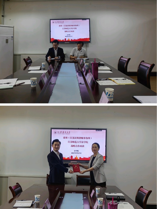 2025年9月17日上午,江苏汉斯律师事务所蒋赛主任一行到江苏师范大学法学院交流座谈,江苏汉斯律师事务所王可莹律师,法学院党委书记庄园、院长张峰振、副院长张兆成参加会议,副院长张杰主持会议。