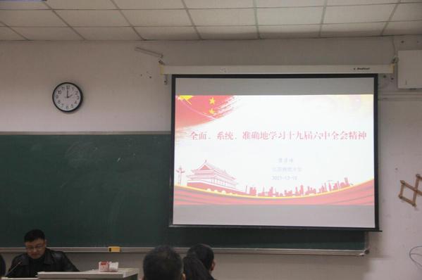 贾彦峰教授以“是什么、为什么、干什么”三个维度为切入点,从“重大意义、全会精神、继往开来”三个方面全面阐释了党的十九届六中全会精神。通过“把握召开党的十九届六中全会作出新的历史决议的重大意议、把握党百年奋斗的初心使命和重大成就、把握中国特色社会主义新时代的历史性成就和历史性变革、把握党百年奋斗的历史意义和历史经验”等方面,对党的十九届六中全会精神给予详细解读。贾教授的报告图文并茂、内容丰富,有理论、有数据、有故事,为我院师生党员准确领会党的十九届六中全会精神提供了科学指导。