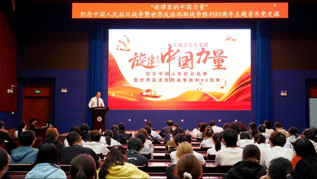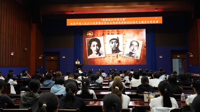 音乐党史课以中国共产党倡导统一战线、引领敌后游击、发动群众支前,以持久战方略凝聚全民意志成为全民族抗战的核心旗帜为主线,以经典歌曲、电影片段、主持人现场讲述等串联起抗战时期党史重大事件,展现近代以来久经磨难的中华民族顽强拼搏、薪火永续,迎来了从站起来、富起来到强起来的伟大飞跃,旨在引导师生始终追寻奔腾澎湃的中国力量,书写新赶考路上的辉煌答卷。