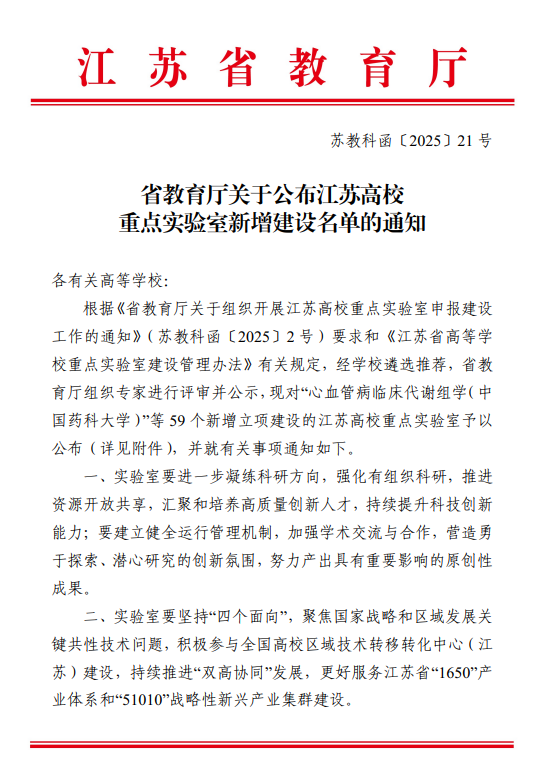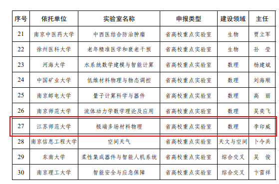 近日,江苏省教育厅发布《省教育厅关于公布江苏高校重点实验室新增建设名单的通知》(苏教科函〔2025〕21号),我校物理与电子工程学院申报的“极端多场材料物理实验室”成功获批。