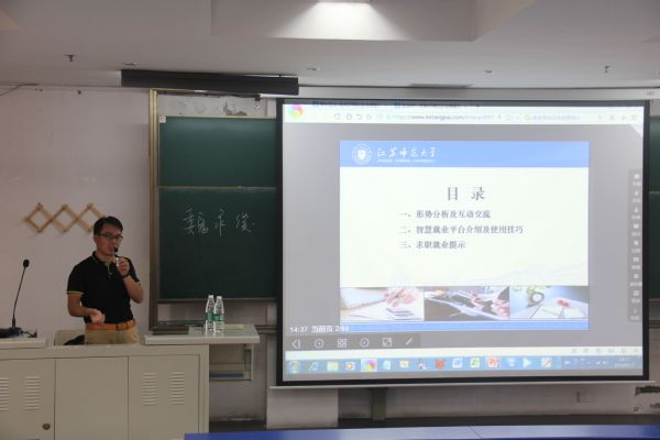 宣讲会上,魏永俊老师为大家做了“应届高校毕业生求职技巧及智慧就业平台应用”的主题报告。活动伊始,魏永俊老师通过大学生理想职场和现实求职场景的对比引出对当前就业形势的思考,结合2010-2019年全国高校毕业生就业人数、2018届本科生就业质量报告和2014-2018本科生就业城市调查指出当前就业形势的严峻性,希望大家要进行准确的自我定位。接着,魏永俊老师向大家介绍了智慧就业平台建设背景及现状,魏老师就学校就业创业信息网、学生用户平台使用、学生就业手续全流程管理等做了详细交流,强调了就业信息平台在毕业生求职就业过程中的重要作用。然后,魏老师从就业信息员队伍建设、就业信息发布、校园招聘时间轴、毕业生就业工作日程等四个方面向大家介绍了学校当前校园招聘重点工作的开展,他提醒大家要及时关注信息发布,合理安排时间。最后,魏老师结合学校2018届毕业生去向分布和机电工程学院2018届毕业生行业分布、区域选择等就业数据对学院毕业生的就业情况进行了分析介绍,他希望大家在就业中做到理性抉择、做好简历、把握时机、注重技巧,掌握就业主动权。
