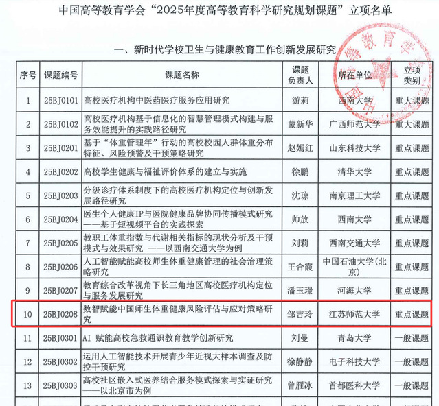 近日,中国高等教育学会正式公布了2025年度高等教育科学研究规划课题立项名单,我院邹吉玲老师主持的课题《数智赋能中国师生体重健康风险评估与应对策略研究》成功获批重点课题,实现了我院在“高等教育科学研究规划课题”重点项目领域的历史性突破。