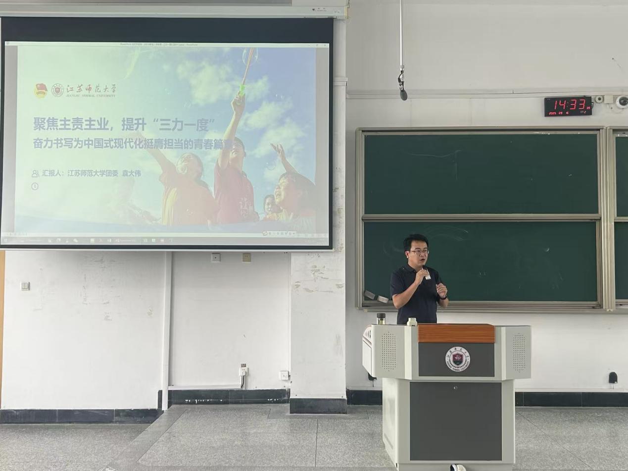 校团委书记袁大伟为新生带来主题为“聚焦主责主业,提升‘三力一度’”的共青团思想教育讲座。袁大伟首先分享了“星汉青年宣讲团”等优秀团队事迹,向同学们展示了共青团在凝聚青年、带动青年方面发挥的关键作用,鼓励新生们坚定理想信念。他重点介绍了“挑战杯”等高水平科创赛事及我校取得的优异成绩,详细说明了项目选题与团队组建的实用方法,激发同学们投身创新创业实践的热情。袁大伟还向新生系统介绍了我校丰富多彩的社团文化与品牌活动,鼓励大家在学习之余积极投身社团工作和实践活动,在服务同学和奉献集体中锻炼综合能力,拓展人生视野。