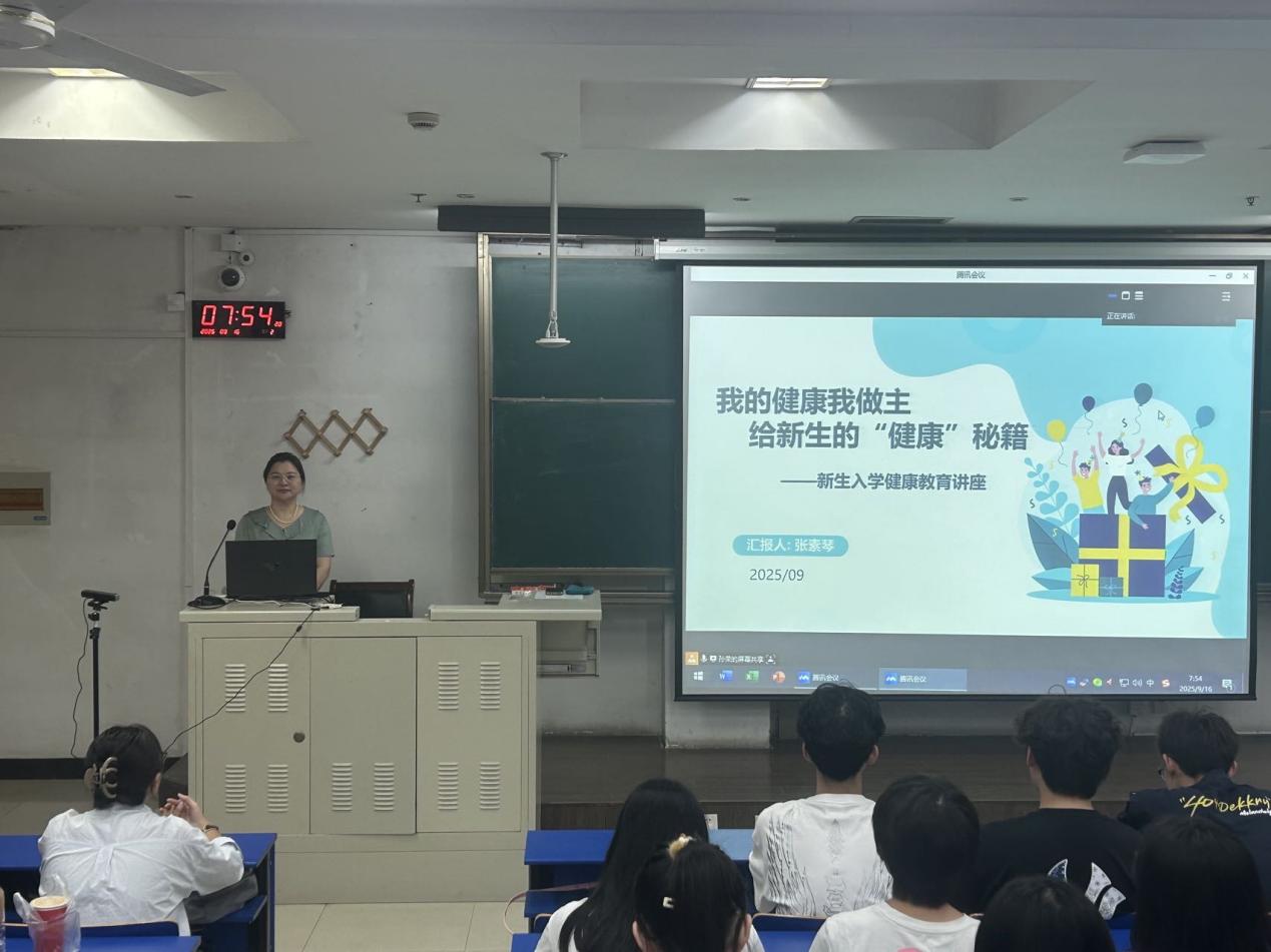 校医院院长张素琴为新生带来健康理念教育,讲座围绕新生校园生活中的健康需求展开。张素琴首先介绍了校医院的服务职能、就诊流程及居民医保的参保意义与使用规范。随后,她针对流感、肠胃炎等校园常见病的诱因与防治手段进行细致讲解,深入剖析传染病的传播路径与防控关键。她还详细拆解了心肺复苏的操作要领,邀请新生上台进行模拟演练,手把手指导按压深度、呼吸频率等关键细节。此外,张素琴还结合校园生活场景,普及了烫伤应急处理、异物卡喉急救、轻微创伤包扎等实用技巧,确保新生在遇到突发状况时能科学应对。