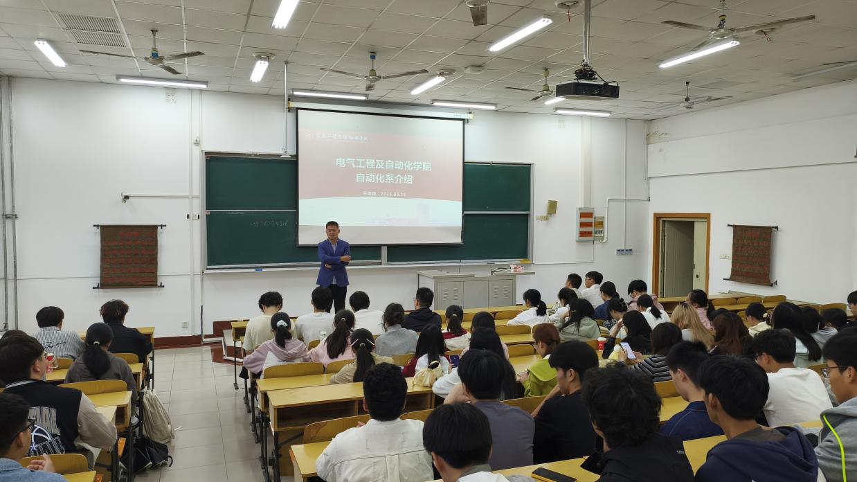电气学院自动化系主任王淑良教授为自动化专业本科生进行了专业教育。王淑良为新生们系统介绍了学院自动化专业的发展历程、建设成果与师资队伍,回顾了自动化技术从早期机械自动化到如今与人工智能深度融合的发展脉络,并介绍了专业的就业前景,涵盖工业自动化、系统集成等领域,常见岗位包括自动化工程师、控制系统设计师等。他还与同学们亲切交流,共同探讨自动化专业的未来发展趋势,并耐心解答大家关心的问题。在讲座的最后部分,王淑良详细解读了自动化专业的培养方案,列举了电路原理等核心课程,并就课程学习重点、考研方向及就业准备等问题为新生提供细致解答,帮助同学们明确学习目标、合理规划学业发展。