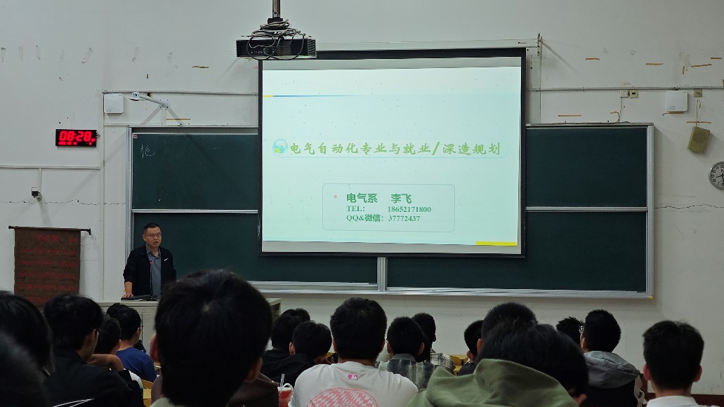 电气学院电气工程系主任李飞副教授为电气工程及其自动化专业本科生进行了专业教育。李飞系统介绍了本专业的课程体系与人才培养目标,强调扎实的专业基础与突出的实践能力是成长为高素质工程人才的关键,指出毕业生可在电力系统、自动化控制、设备研发等广泛领域从事技术、设计或管理工作,也可选择攻读研究生继续深造。他还针对电气工程领域的就业前景进行了梳理,涵盖了电力电子与电力传动、能源系统等多个发展方向,并建议学生应结合个人兴趣与长远职业规划,科学选择适合的专业路径。他鼓励大家在学期间积极考取行业资格证书,主动参与学科竞赛及企业实习实践,不断积累经验,提升自身专业竞争力和综合素质。