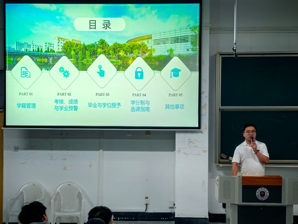 电气学院许朋老师为新生开展了关于学分制政策解读与教务系统操作的专题培训。培训中,许朋从入学注册、学籍卡管理、学分构成等方面为同学们进行了系统讲解,特别强调学籍信息维护和材料保存的重要性。他详细介绍了学校学分制的实施办法,包括各专业的学分要求和人才培养方案的具体内容。许朋还现场演示了教务系统的各项功能,重点指导新生如何完成选课、进行教学评价、查询个人课表、查看成绩和计算绩点等日常学习中常用的操作,帮助新生更快适应大学学习与管理模式。