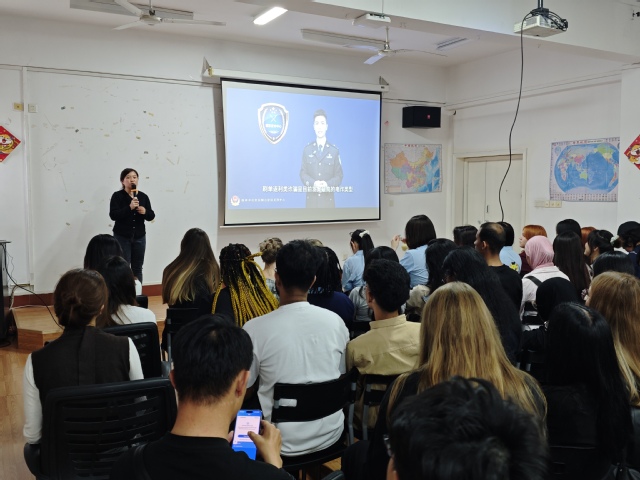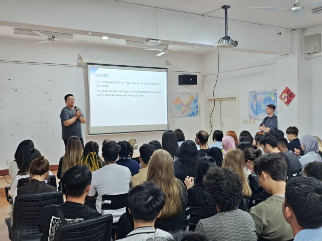 出入境管理支队王成警官围绕《中华人民共和国出境入境管理法》,系统讲解外国人入境出境流程、签证申请流程、临时住宿登记规范及人身财产安全保护知识重点强调合法居留是保障学业的前提,提醒学生密切关注签证有效期及时办理相关手续。