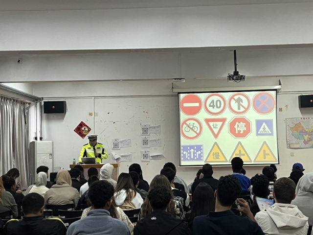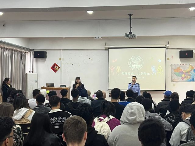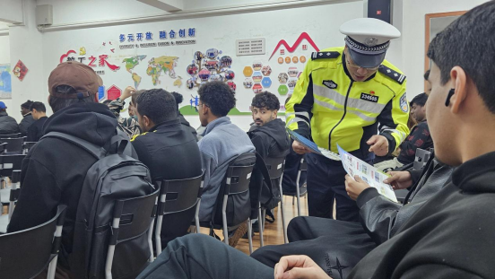禁毒与交通安全宣讲同步开展。禁毒支队预防教育队队长王妍以拒绝毒品 共享阳光为题,结合中外法律体系差异,用真实案例揭示毒品危害,明确吸毒违法、贩毒犯罪的法律红线,警示学生勿因文化误解或侥幸心理触碰底线。铜山交管大队副大队长王波与宣传科科长马运川则聚焦中国交通规则,通过实景图片事故案例,细致讲解校园周边及市区出行安全要点并在现场发放交通安全宣传彩页,帮助学生直观掌握交通标识、骑行乘车规范、培养文明出行习惯。