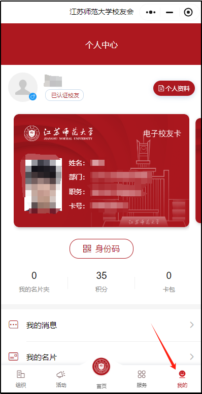(3)申领成功后,选择“我的”菜单,即可看到电子校友卡界面。凭借此界面向对接工作人员证明校友身份。