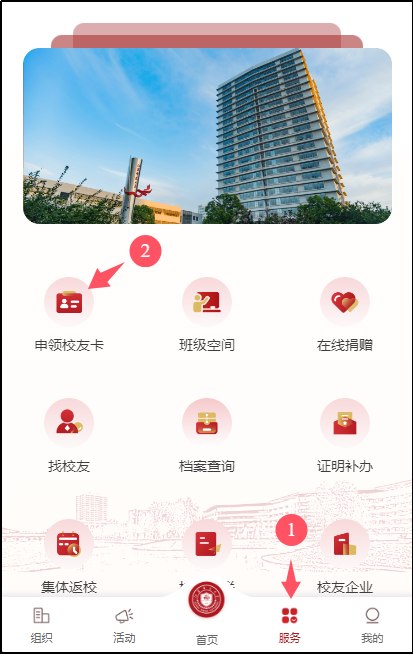 (2)登录后,选择“服务”菜单,然后点击“申领校友卡”模块。