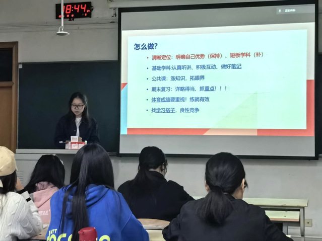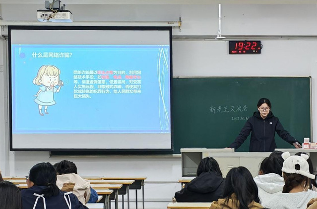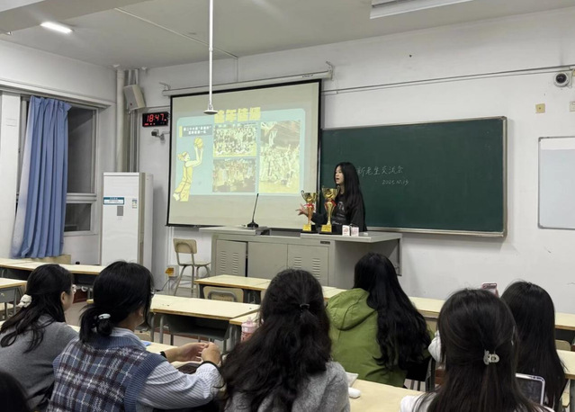 在生活美食板块,23教11班常可涵结合手绘校园地图,详细介绍了校园小巴1元通勤、“江苏师大后勤”公众号充值电费等便捷服务,并推荐了校内外的热门美食,新生们认真记录,纷纷表示“被种草”。考风考纪环节,24教11班束昕祺手持《学生手册》解读相关规定,通过真实案例强调考试作弊的严重后果,同时提醒大家注意日常安全,如走路不看手机、离宿及时锁门等。围绕反诈安全主题,24教12班李姝娴剖析了刷单返利、虚假购物等常见诈骗手法,带领新生熟记“十个凡是”反诈口诀,并现场演示如何使用国家反诈中心APP学习防骗知识,帮助大家守好“钱袋子”。宿舍生活方面,24教14班车雨晴介绍了宿舍注意事项,明确违禁电器与安全隐患,鼓励新生与舍友共同营造温馨居住环境,通过互相包容、偶尔赠送小礼物等方式增进情谊。情感交往板块,24级预科班宋北涵从亲情、友情、爱情三个维度给出建议:多与父母沟通,友情中主动破冰、尊重差异,对待爱情顺其自然、专注自我成长。在个性发展环节,24教13班张子怡结合担任班委的经历,介绍了班级13个岗位的职责与工作技巧,鼓励新生积极参与集体事务,提升综合能力。第二课堂部分,教育学院女篮团队展示了“希望杯”冠亚军奖杯,分享了日常训练、团队民主氛围以及体育锻炼的收获,吸引新生踊跃加入。交流会尾声,各专业优秀学生代表分享了专业学习经验,强调“自主制定计划、课前预习、课后复习”的三步学习方法,建议结合兴趣选修课程,遇到困难主动求助,平衡学习与生活,为未来成长夯实基础。