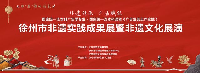 为更好的弘扬非遗文化,由徐州市非物质文化保护中心、江苏师范大学教务处举办,传媒与影视学院国家级一流本科广告学专业策划的“非遗传承,广告赋能——徐州非遗实践成果展暨非遗文化展演”将拉开帷幕。诚邀全校师生与社会各界共赴这场“传统焕新”的沉浸式之约。