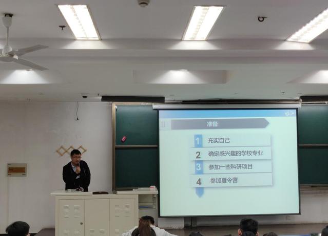 16机51班李达汉同学以心态、准备、拼搏三个关键词展开自己的交流,通过保研后参与就业招聘会的感受,建议大家尽早明确未来选择。李达汉从充实自己、确定专业、参加科研项目、参加夏令营四个方面做了交流,他提醒大家有意向保研的同学一定要提前准备,参加目标高校的夏令营,提升自己的保研竞争力。