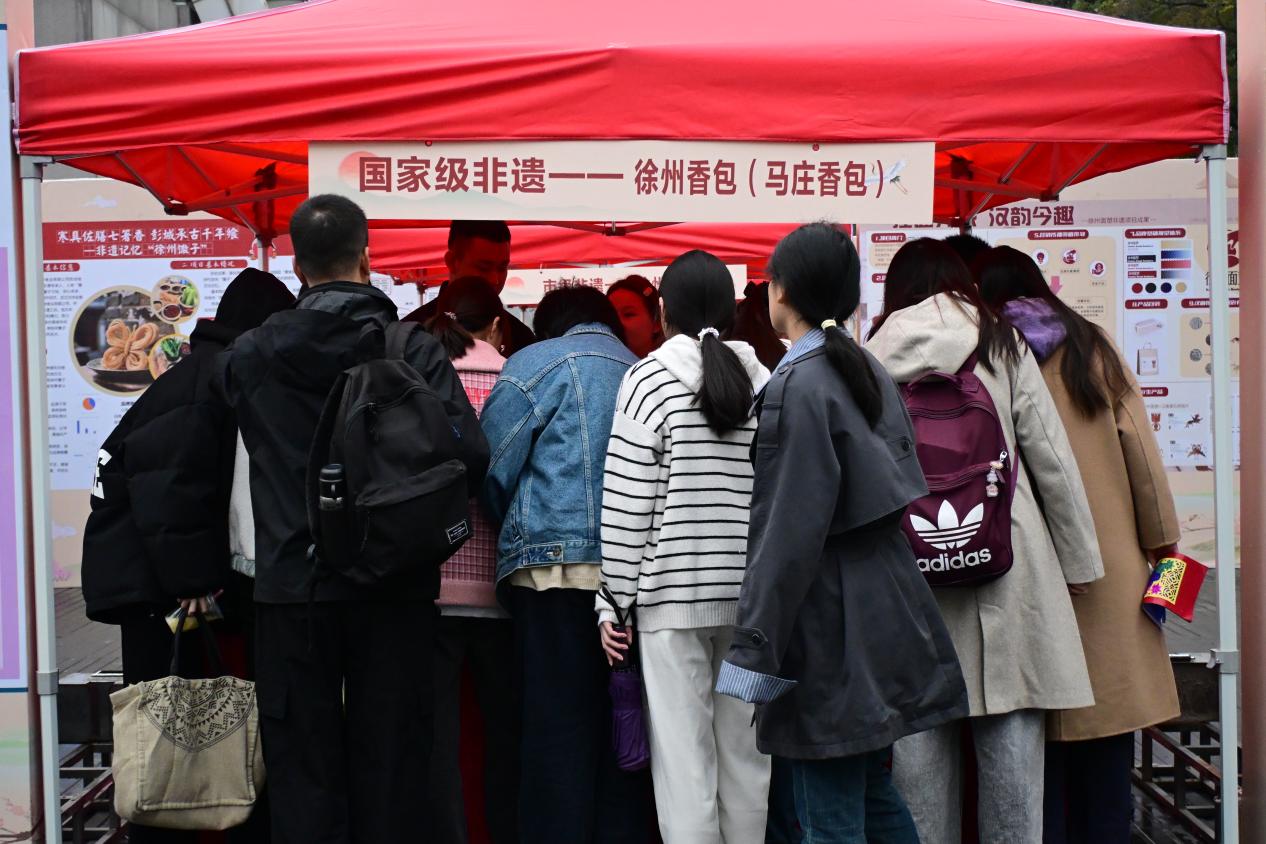 展演现场采取实践成果展览和非遗传承人现场展演相融合的方式进行,马庄香包、邳州纸塑狮子头、冯天兴烧鸡等18个非遗项目的传承人向参观人员介绍着产品的特点、展示着绝活;广告学专业的学生则讲解着其为对应非遗项目量身打造的市场调研报告、营销传播策略及创意设计方案,传统技艺与潮流审美的碰撞,迸发出别样的文化火花。