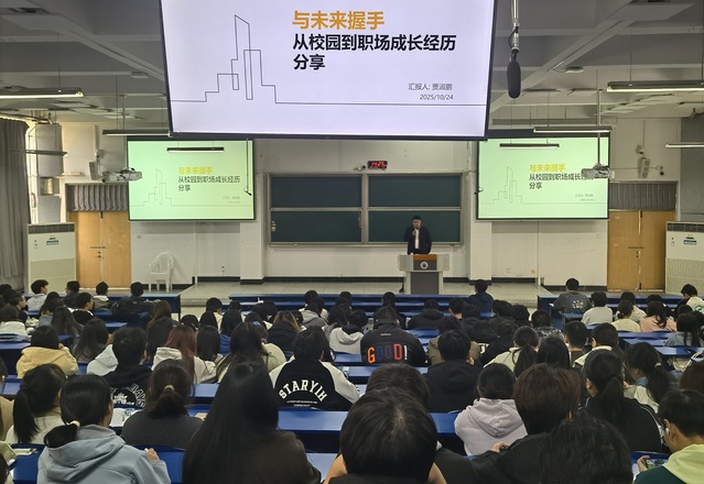 贾淑鹏以思维破局为切入点,回顾了自己大学期间对个人专业前景探索和职业发展规划,从备考公考时的目标确立,到投身招商工作时的实战积累,再到成长为国企高管的进阶历程三个方面梳理了个人职业路径。引导同学们要精准认清自身优势与短板,结合行业趋势选择适合自身的职业发展赛道;要始终保持学习热情,持续学习力是职场的核心竞争力,需主动关注行业动态、补充专业知识,将每一次挑战都视为成长的契机,在实践中锤炼职业能力。