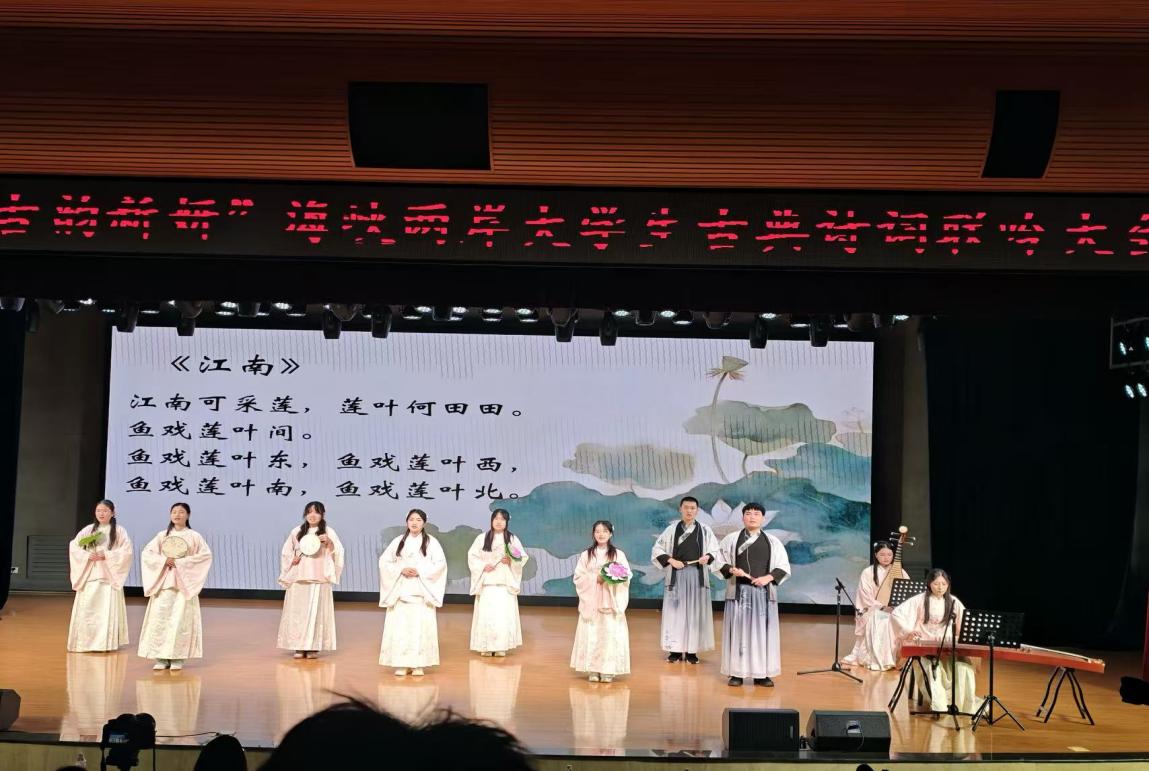 在大会主题研讨会落幕之后,来自海峡两岸的11个诗社携手献艺,以“吟唱”为纽带,将37首中华古典诗词化作动人乐章,为现场观众呈现了一场兼具文化深度与艺术美感的视听盛宴。其中,文学院“悠然诗社”的表演尤为亮眼,诗社成员身着雅致服饰,在古雅清幽的舞台上,以婉转悠扬的腔调吟唱乐府民歌《江南可采莲》《上邪》《西洲曲》。社员们以声传情、以情入境,生动诠释了古典诗词的韵律之美与文化内涵,每一段吟唱结束,现场都响起雷鸣般的掌声,现场丝竹悠扬,气氛热烈,充分让观众领略了中国诗词之美、中华文化之美。