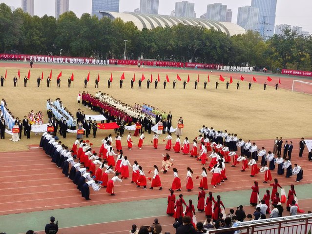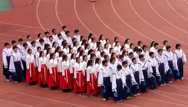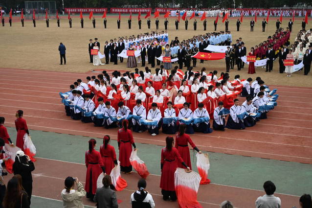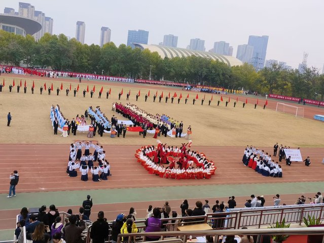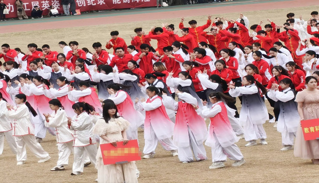 方阵队员服装统一、动作整齐,通过富有创意的队形变换,生动演绎了中华民族不屈不挠的奋斗史诗。从“烽火集结”到“胜利曙光”,从历史回望到青春飞扬,同学们以精准的动作和流畅的衔接,将红色基因与青春风采完美融合,赢得全场掌声如潮,拉开了运动会精彩序幕。