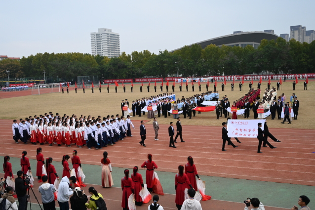 10月30日上午8时,运动会正式开幕。教育科学学院方阵在学院领导班子成员带领下,迈着坚定步伐,意气风发步入会场。“八秩荣光,五星耀芒,乘风破浪,教科担当”的口号响彻云霄。