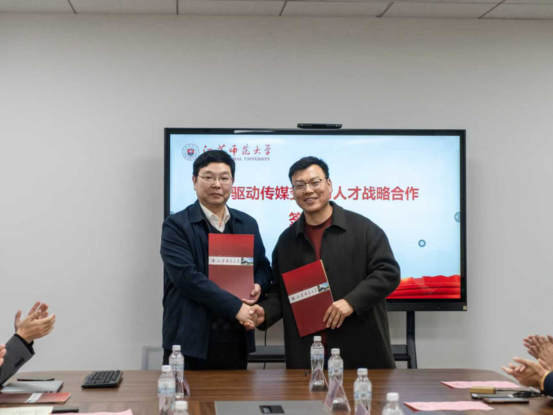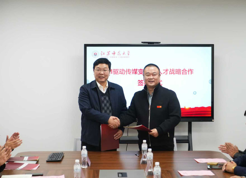 11月3日下午,传媒与影视学院与徐州市新媒体协会联合举办“AI驱动传媒变革与人才战略合作”签约仪式。院长孟宪浦分别与徐州市新媒体协会会长李昂、徐州市九段数字科技有限公司总经理张飞签订合作战略协议。徐州市新媒体协会部分副会长、秘书长等以及学院领导、教师代表出席仪式。