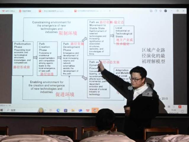 报告伊始,胡晓辉教授从定性研究设计的严谨性与可靠性切入,系统阐述了定性研究包含询问研究问题、选择案例和参与者等环节。他通过对比定性研究与定量研究,指出定性研究更侧重“how and why”的深层探究,建议案例选择可采用随机案例、信息导向案例等,为在场师生厘清了定性研究的方法论框架。在案例分享环节,胡晓辉教授结合其研究成果展开深入讲解。他展示了区域产业路径演化的初始理解模型,分析了限制环境与促进环境对新技术、新产业涌现的影响,以及路径依赖稳态与动态发展的不同走向。此外,他还强调案例研究的重要价值,打破了师生对案例研究的普遍认知误区。报告最后,胡教授与在场师生就“区域发展模式的实用性”等问题进行了互动,其深入浅出的解答和独到的学术见解让在场师生深受启发。