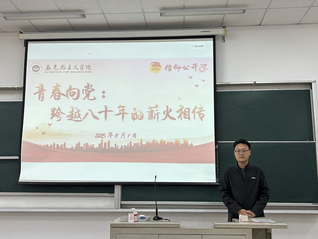 为深入学习贯彻习近平新时代中国特色社会主义思想,扎实推进青年学生理想信念教育,引导入党积极分子坚定理想信念,11月1日,马克思主义学院举办“青春向党:跨越八十年的薪火相传”主题信仰公开课。活动邀请四位优秀学生党员代表进行专题分享,覆盖学院全体入党积极分子,取得良好反响。