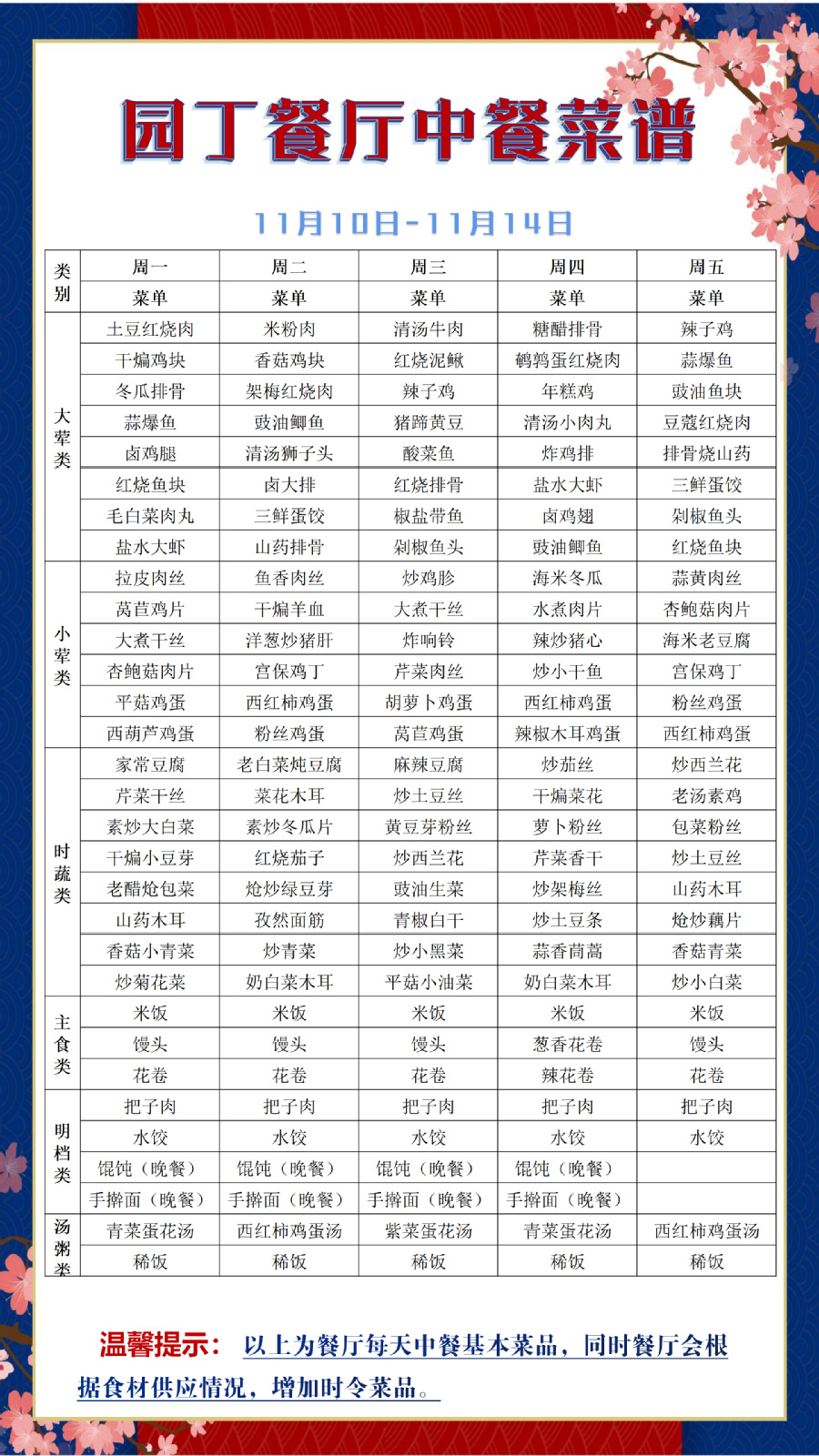 根据大数据分析,餐厅11:25-11:35、11:45-11:50、12:00-12:05三个时间段为就餐高峰期,为了减少排队等待时间,老师们可以选择错峰就餐。