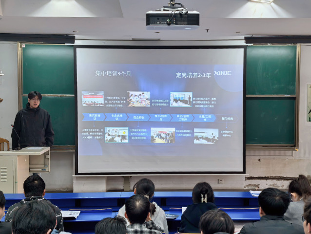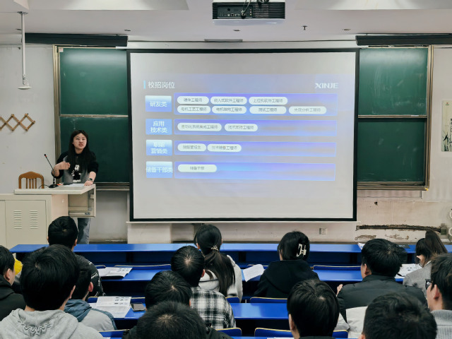 宣讲会上,信捷电气人力资源部主管张琼详细介绍了公司的基本情况、发展历程、企业文化、科技创新成果、合作客户及薪酬福利等内容,帮助毕业生们全面了解企业发展前景和平台资源优势。测试部主管关鹏鹤就本年度招聘岗位作了具体说明,岗位涵盖研发、应用技术、职能营销和储备干部等多个方向,为同学们提供了丰富多元的就业选择。人力资源部业务伙伴张宇琦介绍了入职后的学习支持与职业发展等新员工培养机制,帮助毕业生们明确未来成长空间。