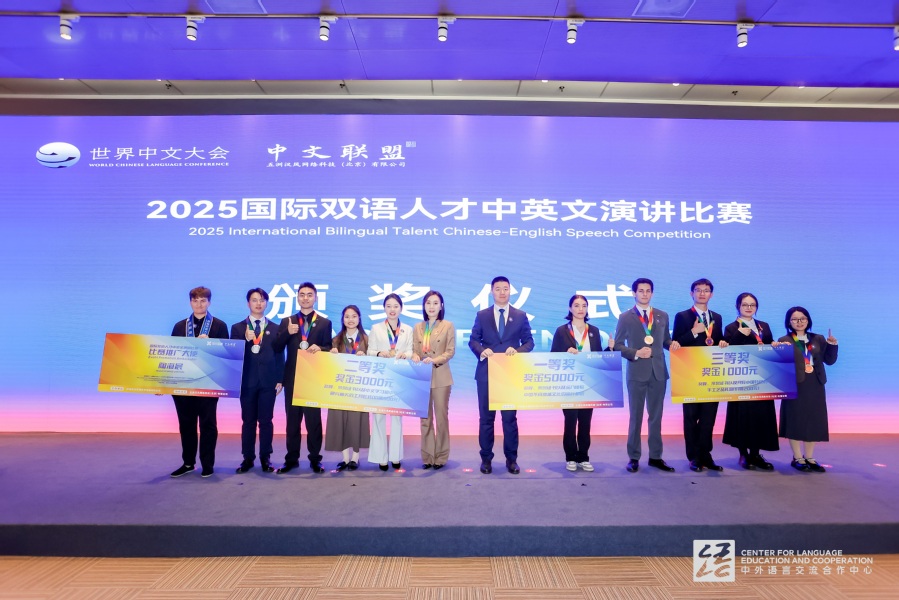 在大会成果发布环节,杜增吉校长受邀参加“中文联盟新平台”正式上线启动仪式并为获奖代表颁奖。我校获评“2025全球中文联盟数智化教学金牌合作伙伴”,我校美国留学生陶海晨同学荣获“国际双语人才中英文演讲比赛推广大使”称号,并受邀参与展演活动。