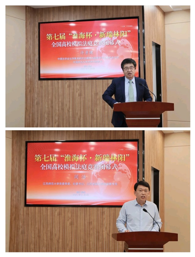 随后,闾浩书记发表讲话。他强调,“淮海杯”全国高校模拟法庭竞赛始终秉持“专业、严谨、开放”的办赛理念,在深化法学教育改革、培育卓越法治人才方面发挥着重要作用;他向本次赛事举办过程中各方通力合作所展现出的凝聚力与担当精神致以敬意,并对全体参赛师生所展现的扎实素养与昂扬风貌予以肯定,期待“淮海杯”赛事在未来持续汇聚青年英才,为中国特色社会主义法治建设注入更多青春力量。