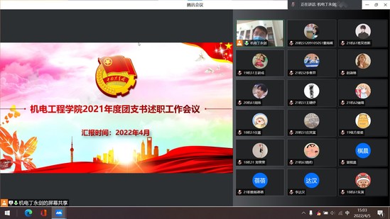 为进一步总结学院团支部年度工作开展情况,不断规范学院团支部的运行秩序,全面提高学院团支部工作活力,2022年4月5日下午3点,机电工程学院团委通过腾讯会议召开2021年度团支书线上述职工作会。机电工程学院团委书记丁永剑老师、各本科生团支部、研究生团支部支部书记以及分团委成员参加了本次述职工作会。会议由丁永剑老师主持。