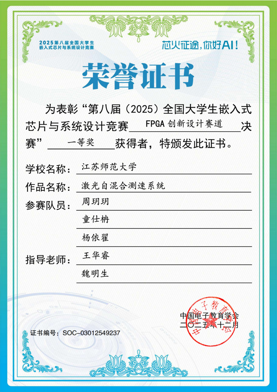 近日,2025 年“全国大学生嵌入式芯片与系统设计竞赛—FPGA 创新设计赛道”圆满落幕,我院学子在本届赛事中表现优异,荣获一等奖 1 项、二等奖 2 项。